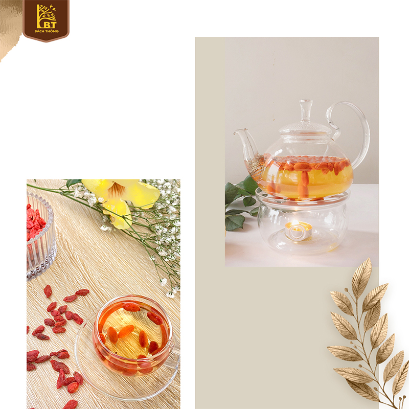Trà câu kỷ tử Bách Thông và táo đỏ: Cho vào ấm trà 3 gram táo đỏ + 4 gram câu kỷ tử Bách Thông. Từ từ cho khoảng 350 - 400ml nước sôi vào và ủ trà từ 7 - 10 phút.